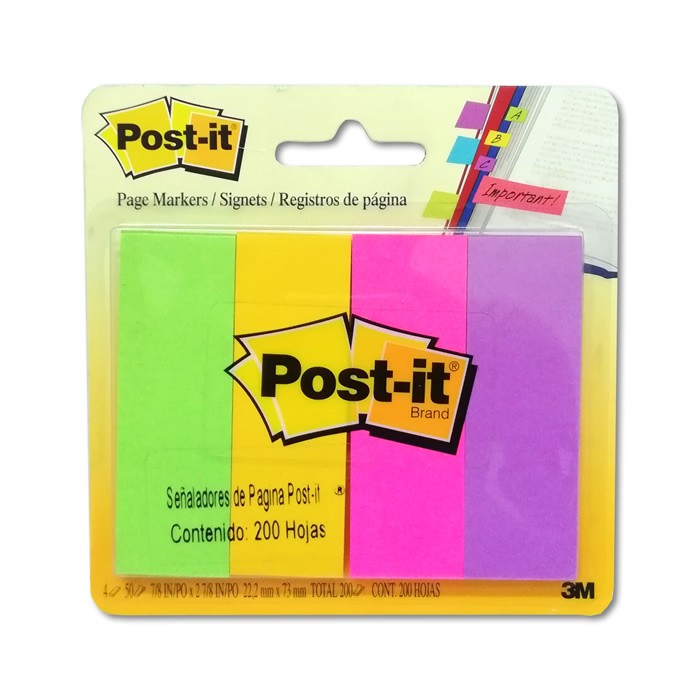 BANDERITAS ADHESIVAS SEÑALIZADORAS DE PAGINA MEDIDA 2.5 X 7.5 CM DE PAPEL CON 4 COLORES NEON DE 200 HOJAS MODELO 671-4AU 3M POST-T