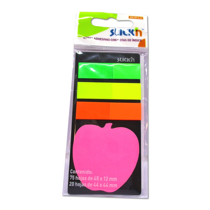 BLOCK DE NOTAS ADHESIVAS MEDIDA 44 MM X 44 MM FIGURA MANZANA Y SEÑALIZADORES DE 75 HOJAS 3 COLORES NEON MEDIDA 45 MM X 12 MM MODELO 21475 STICK´N MAE